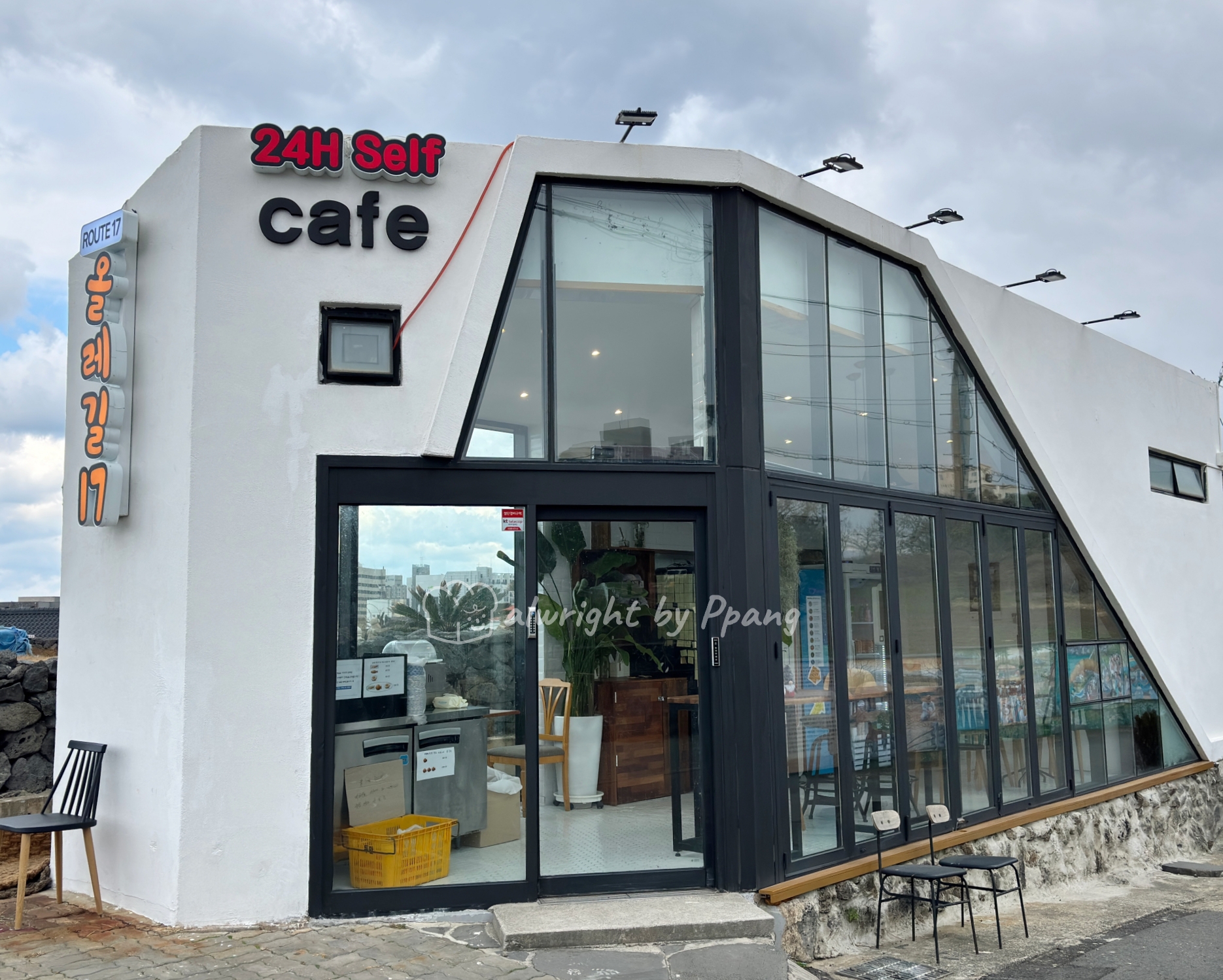 여행 중 비, 바람도 피하고 다리도 쉬어가기 좋은 무인카페, 루트17(올레길17)을 발견했다. 스타벅스 캡슐커피와 음료가 있어 취향도 맞춰주는 가성비 좋은 셀프 카페이다.