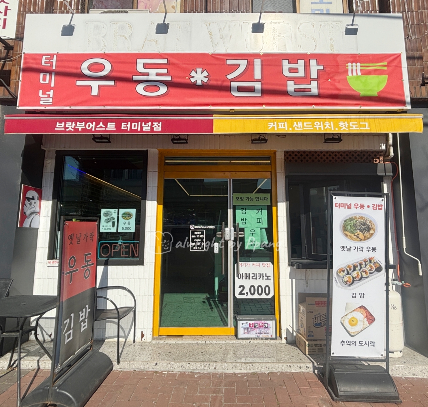 속초시외버스터미널 앞에 가볍게 우동 한그릇 하기 좋은 터미널 우동 김밥 집을 발견했다. 원래는 브랏부어스트라는 샌드위치점이었던 것 같은데 간판을 바꾸고 우동, 김밥, 커피를 판매한다.