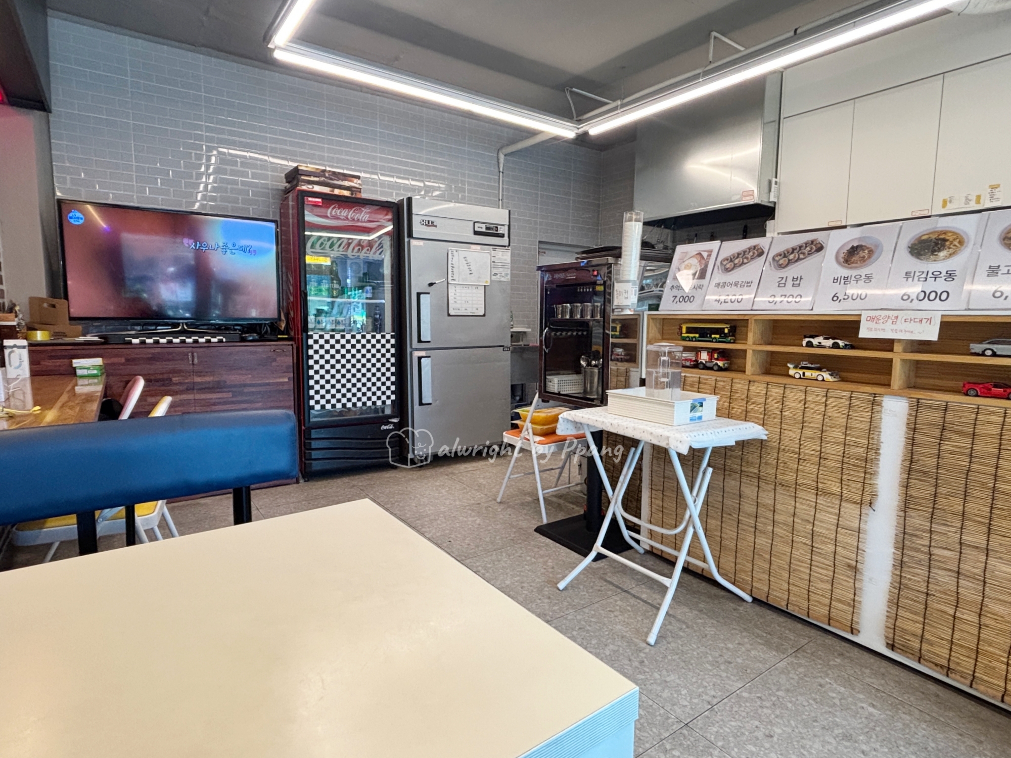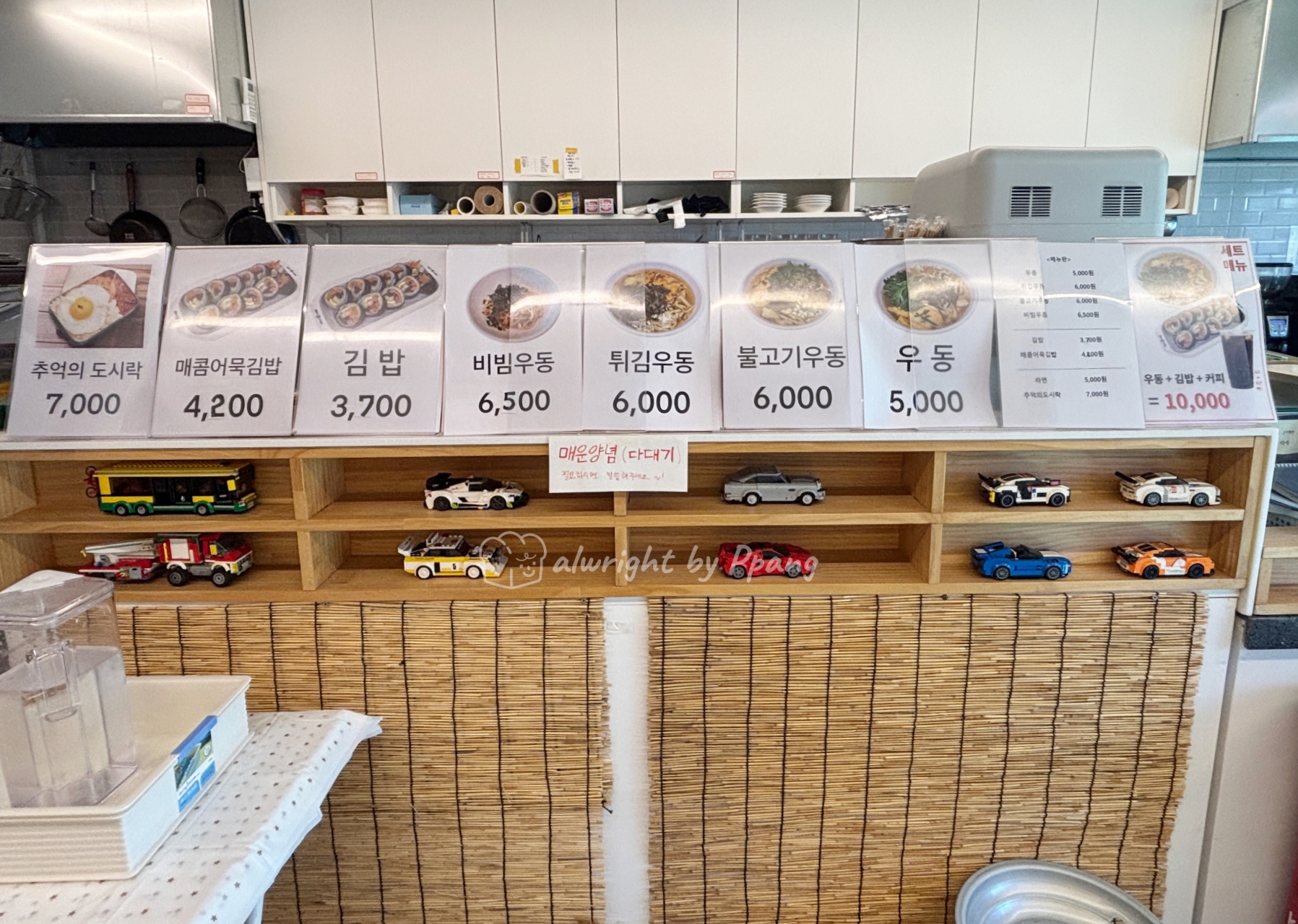 메뉴는 우동, 김밥, 도시락이 있고, 음료와 커피가 있다.