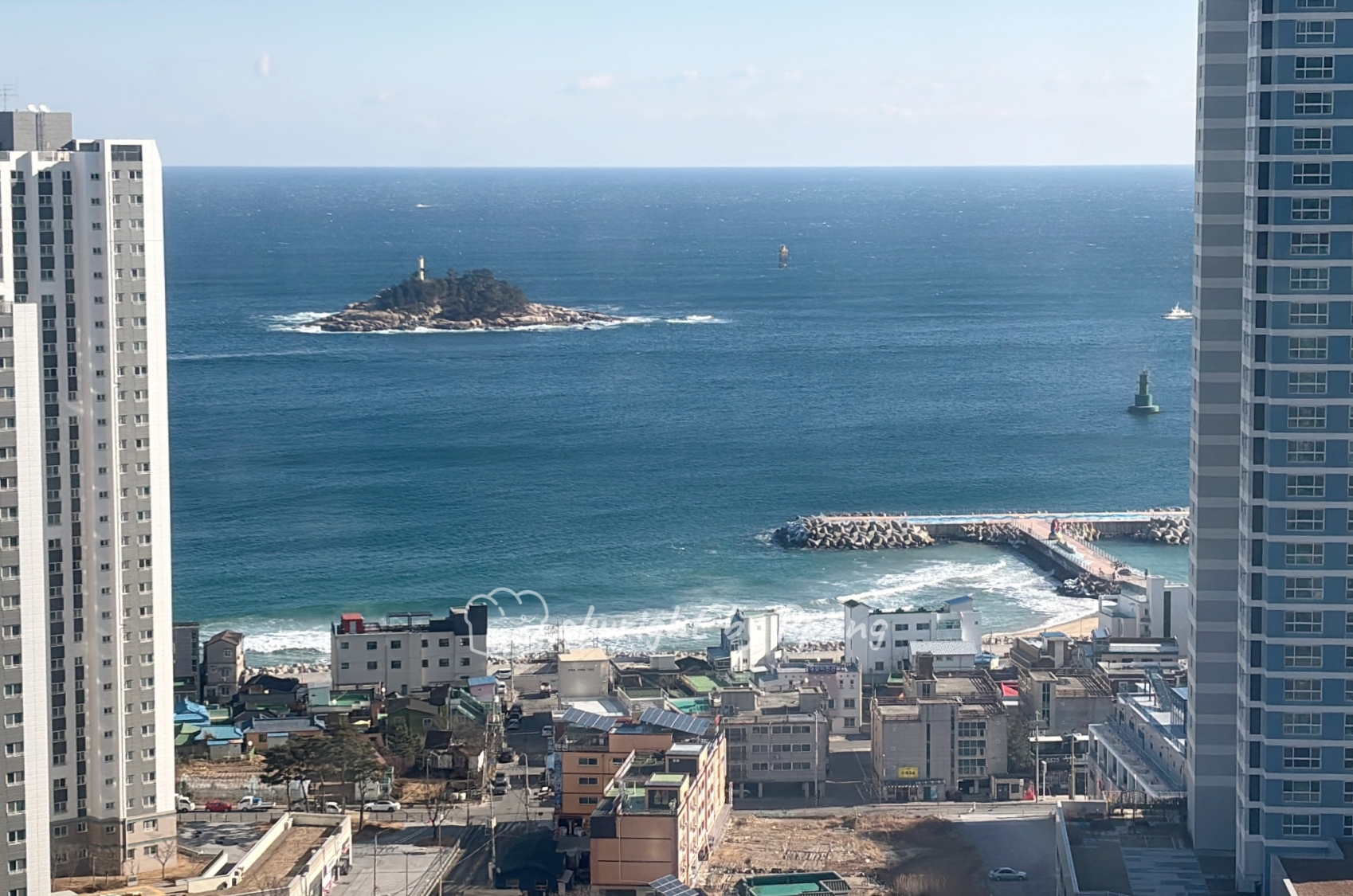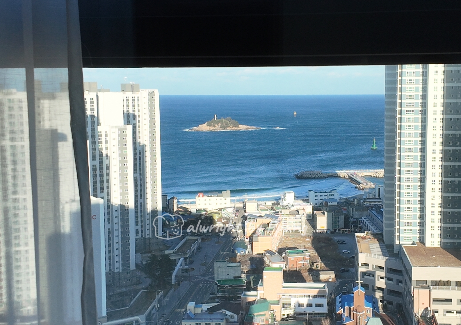 창문 앞에 높은 건물이 있긴 하지만 그 사이로 속초 해수욕장과 조도(섬)가 보인다.