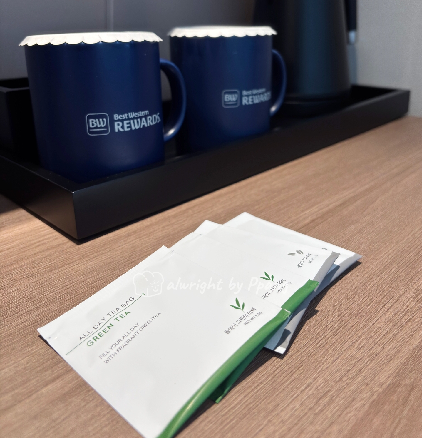 무선전기주전자와 머그컵, 녹차와 커피가 준비되어 있다.