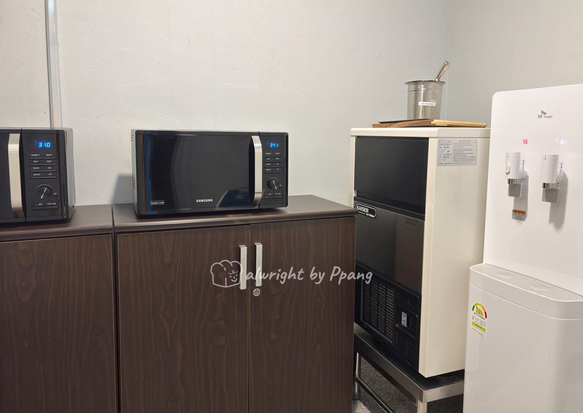 아직 조식당은 운영하지 않으며 1층 프론트데스크 옆에 키친네이트가 있다. 24시간 무료 이용할 수 있고 전자렌지, 정수기, 제빙기가 있다. (위 사진)