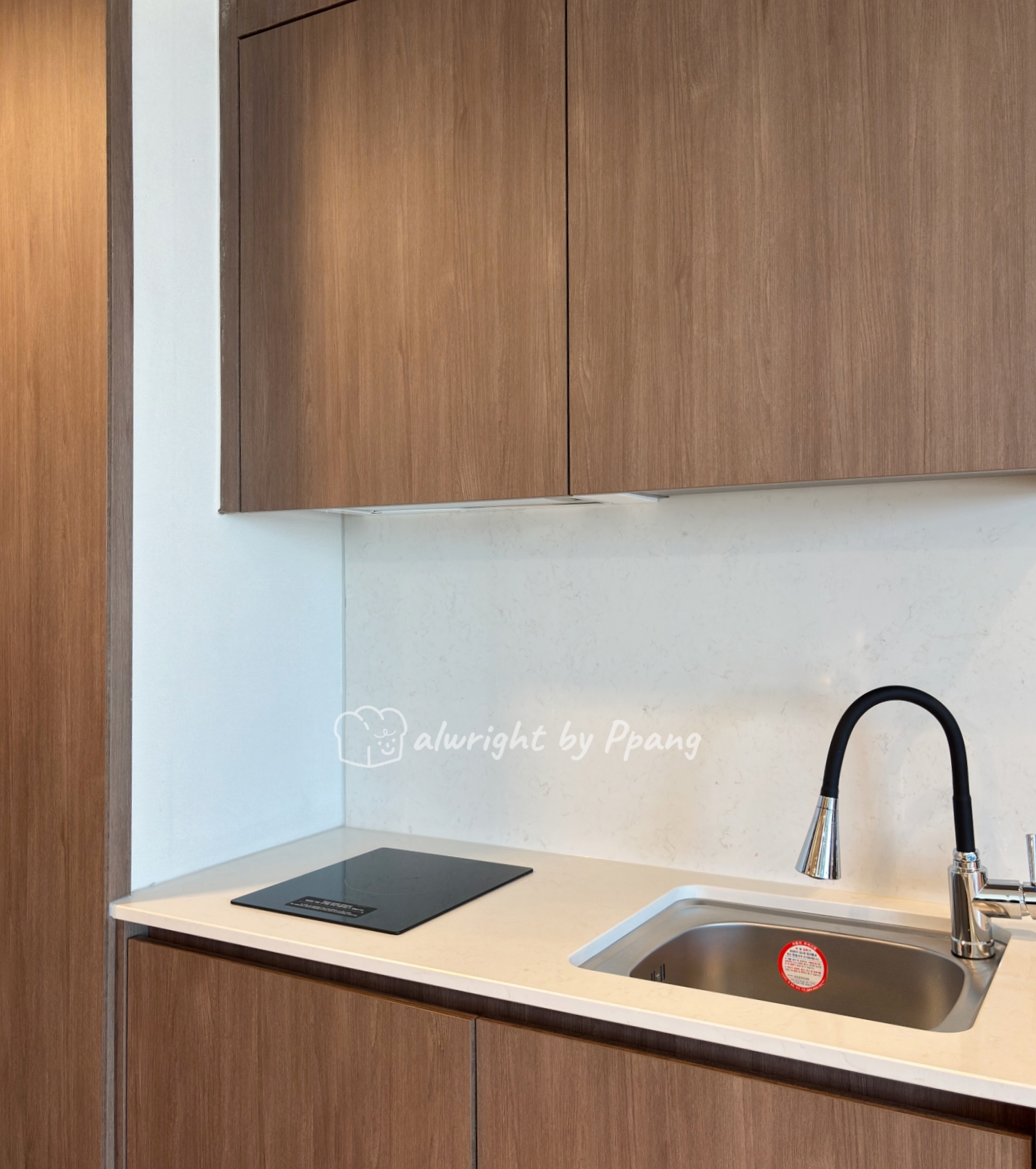 현관문과 TV 사이에 인덕션, 싱크 등 간단한 취사시설이 있다. 다만 인덕션에는 '사용할 수 없다'는 스티커가 붙어 있다. 인덕션을 사용할 수 없으니 당연히 주방 기구 같은 것도 준비되어 있지 않다. 그냥 시설만 해 놓았다. 추후 스테이, 레지던스로 분양할 계획이 있는 것 같다.