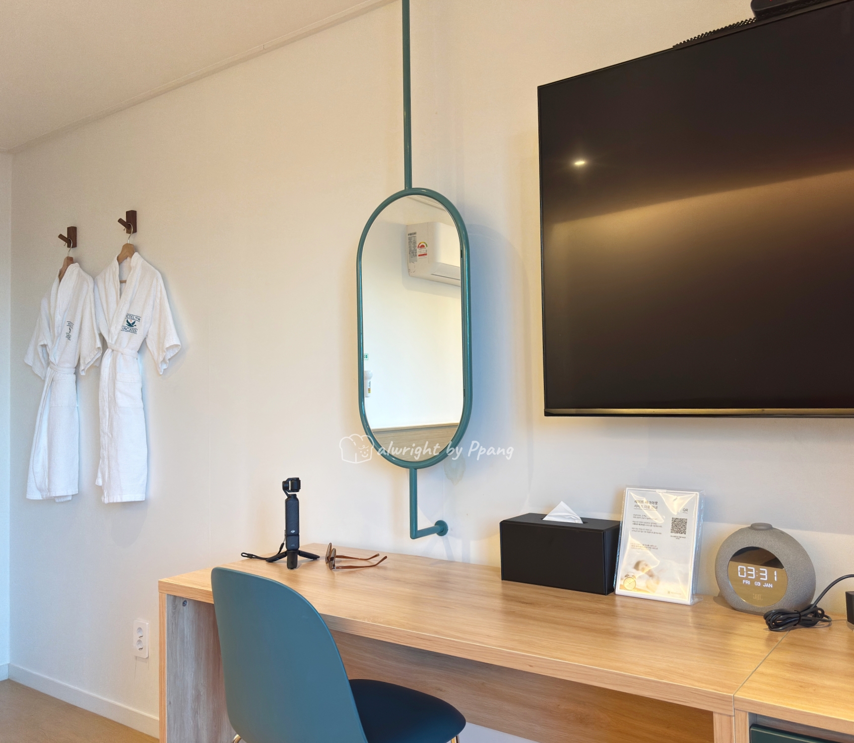 전면에는 TV가 있고 사이즈가 커서 좋다. 블루투스 스피커도 준비되어 있다. 거울도 잘 골랐고 크지 않아 좋다.
