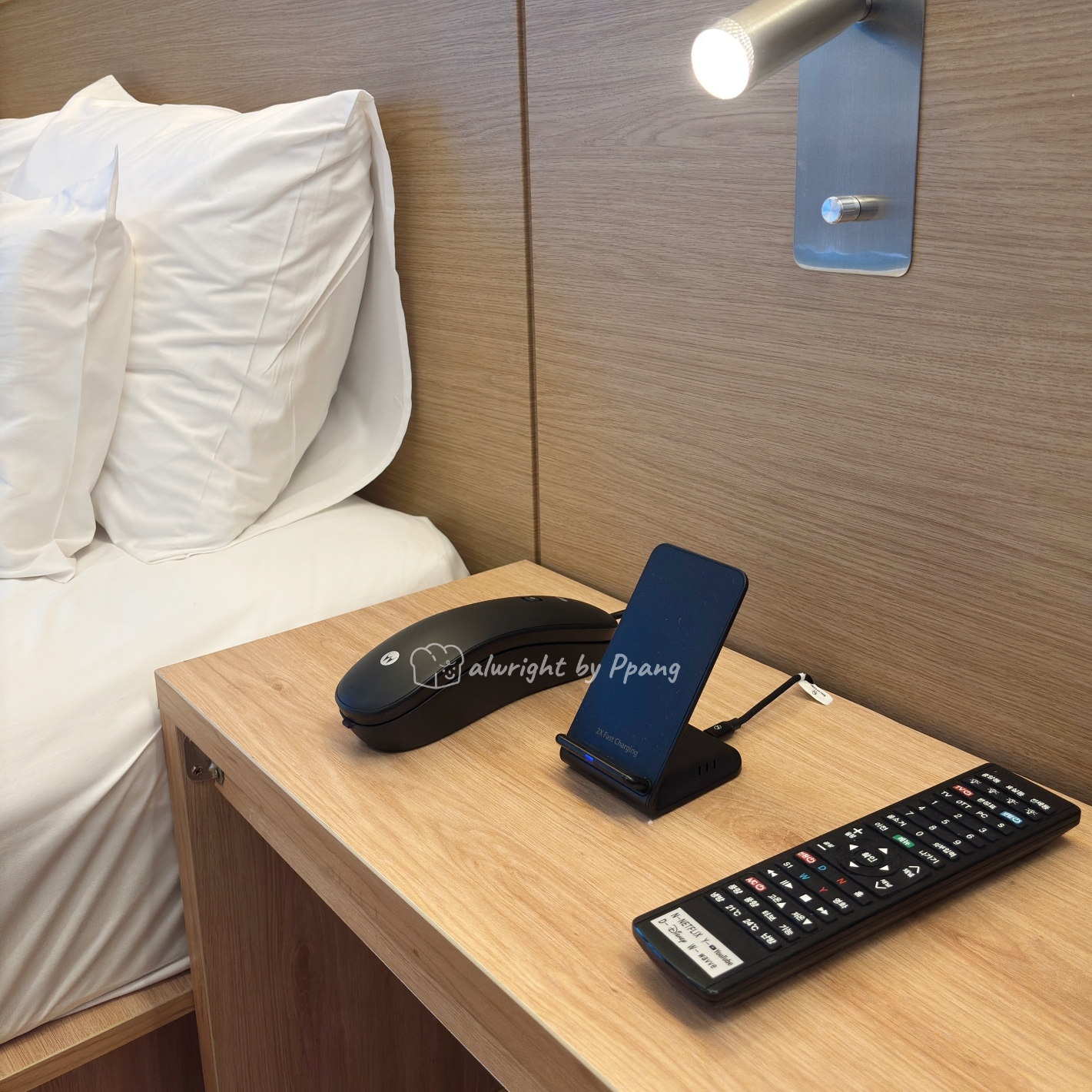 협탁에는 전화기와 함께 핸드폰 충전 및 거치대가 있다.