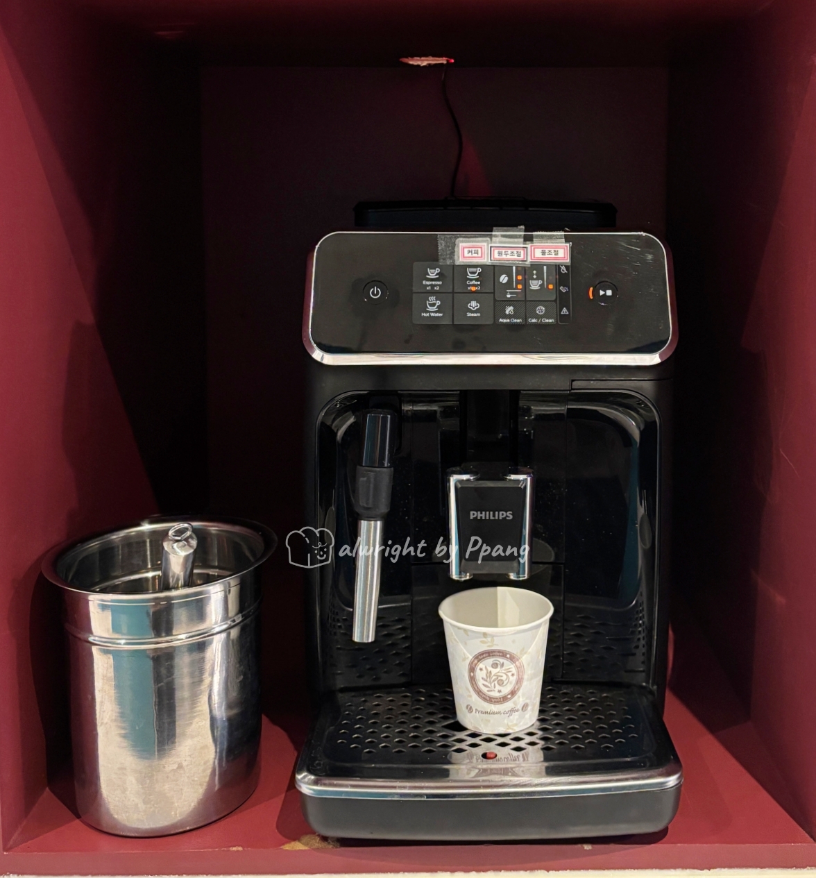 우유, 주스, 요거트가 있고 원두커피 머신은 조식당 입구에 제빙기, 정수기, 생수와 함께 따로 준비되어 있다.