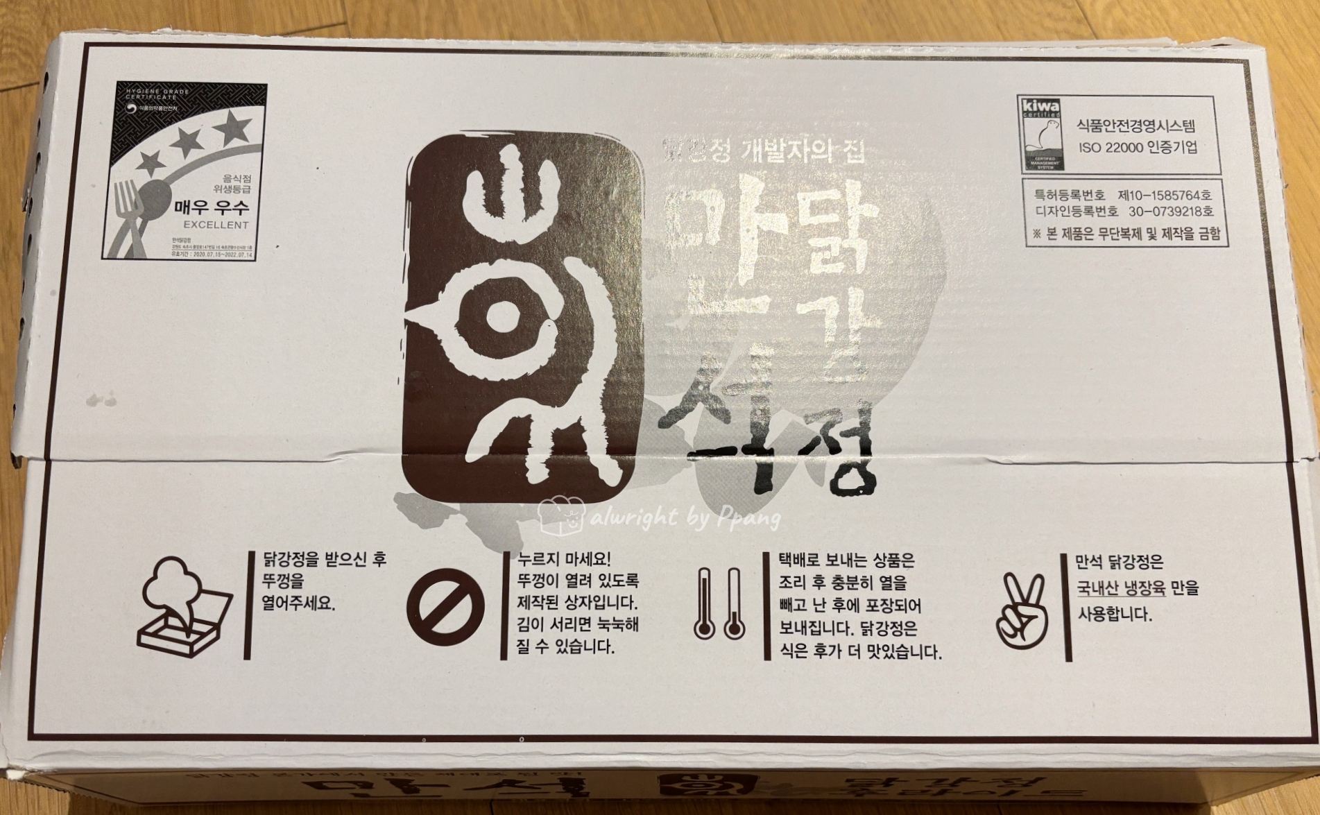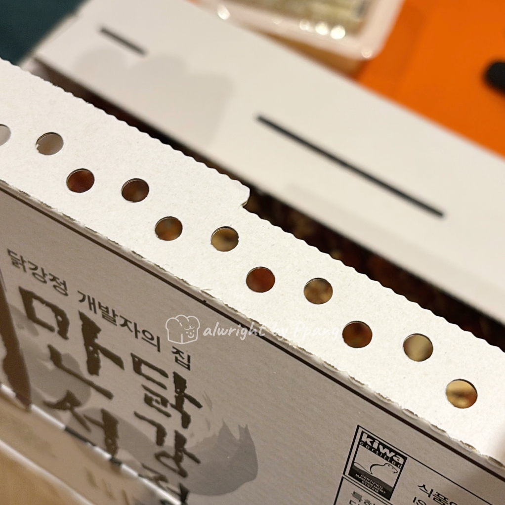만석닭강정의 상자도 독특하다. 튀김요리의 김이 잘 빠지도록 뚜껑 옆면에 구멍이 뚫려 있고 상자 뚜껑이 살짝 뜨게 설계되어 있다.