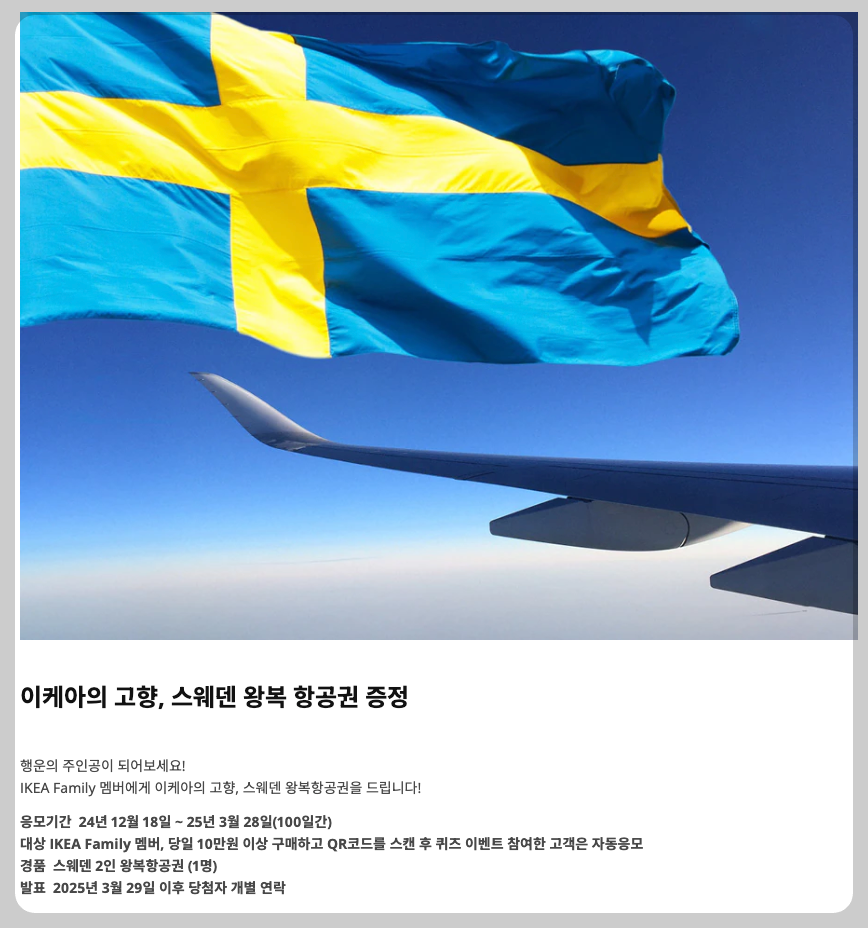 스웨덴 왕복항공권 이벤트는 전 점 공통으로 진행하는 것 같습니다. 지난 12월 18일부터 구매 이력이 있거나 앞으로 구매 예정이라면 체크해 보십쇼.