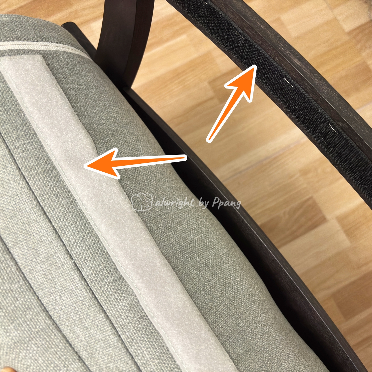 쿠션 연결은 아주 쉽습니다. 쿠션 포장지 뜯어서 프레임 위에 올리고 목받침 부분쯤에 있는 찍찍이와 의자에 있는 벨크로 테이프 붙여 주면 됩니다.