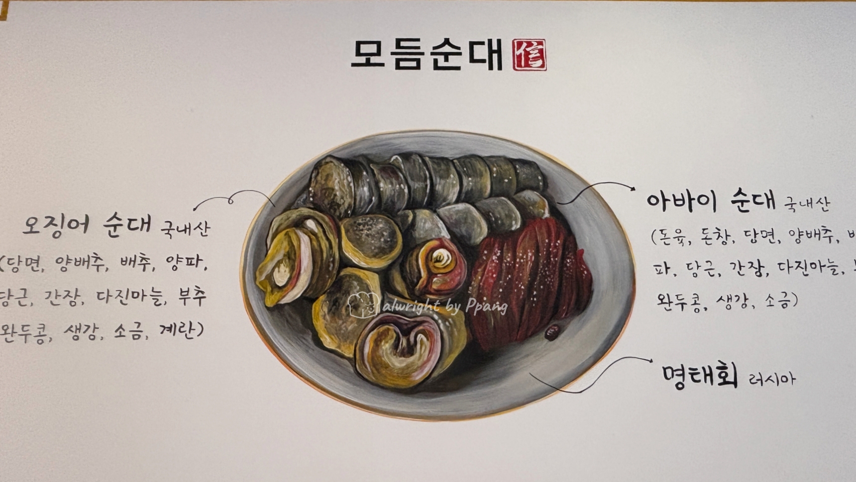 모듬순대의 경우 아바이순대와 함께 오징어순대가 나온다. 여기에 명태회까지 나와서 여럿이 온다면 맛보기로 주문해도 좋을 듯 하다.