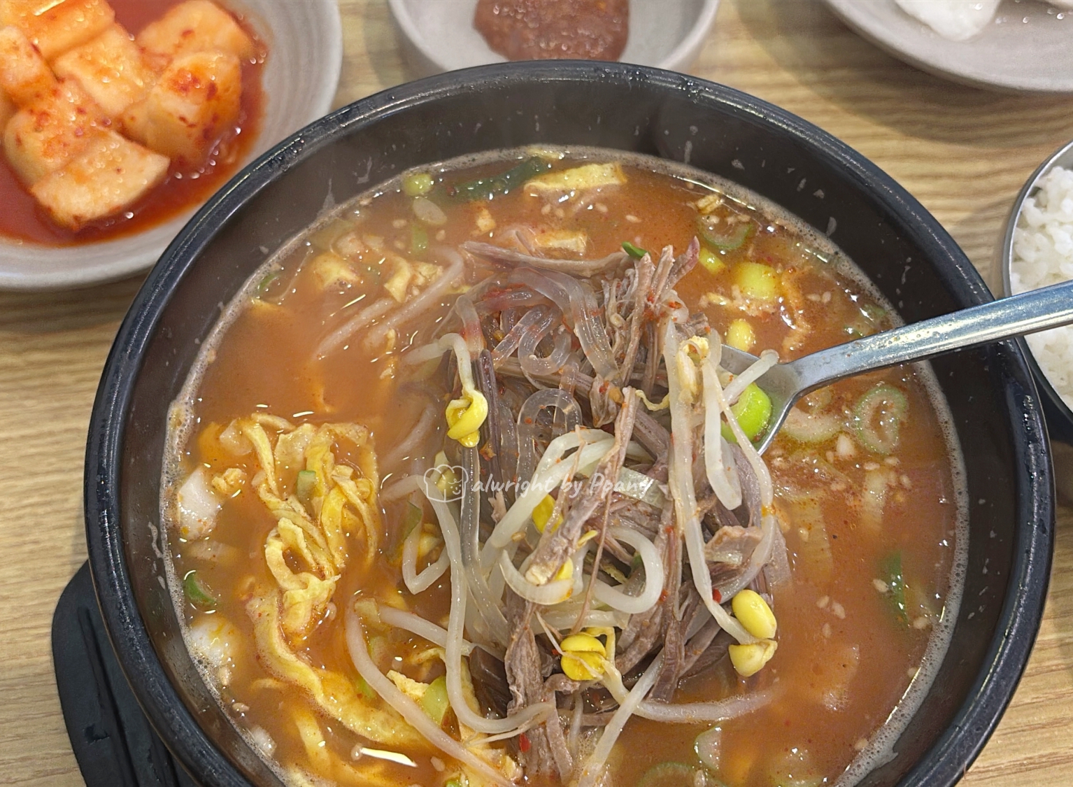 양념장을 풀어 보니 얼큰한 국물이 되었다. 뚝배기에는 콩나물, 삶아서 찢은 소고기, 고사리, 당면 등이 가득 들었다.