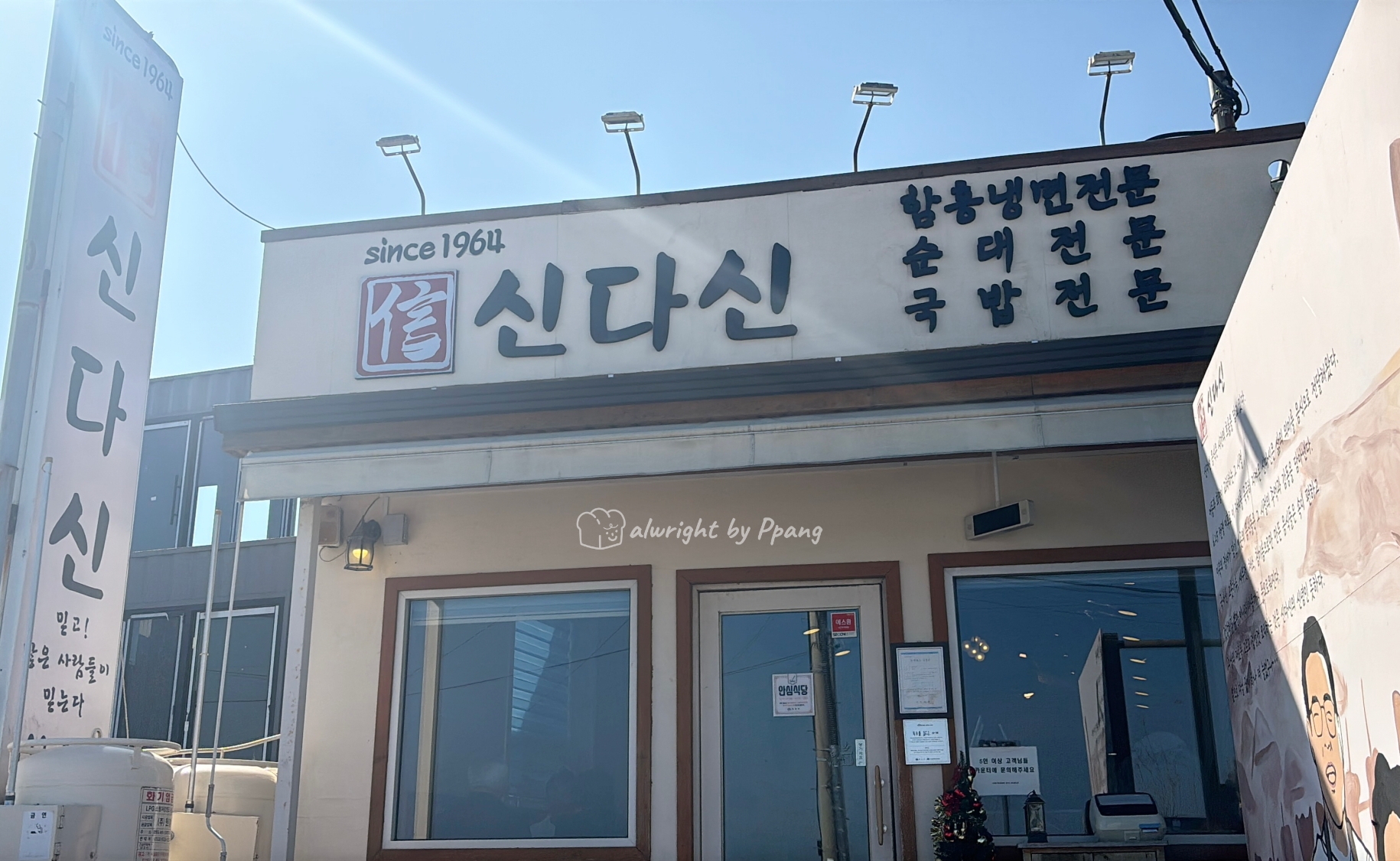 속초 아바이마을 갯배에 내려 길을 건너면 사람들이 빨려 들어가는 골목이 있는데 여기 단천식당과 나란히 신다신 2호점이 있다. 신다신 1호점은 골목에서 마주보고 뒷문이 있다.