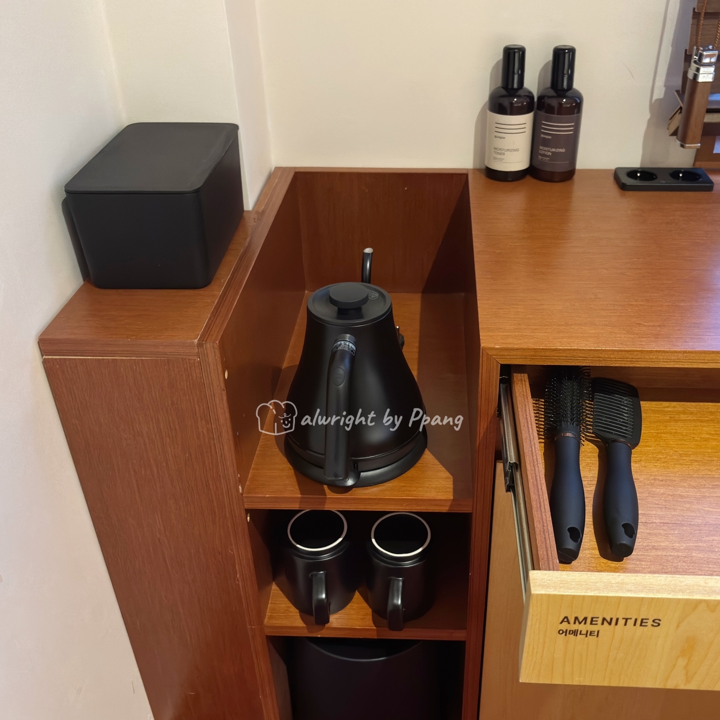 책상 끝에 필요한 것들이 정리되어 있다. 무선주전자와 머그컵, 빗, 드라이기, 토너, 로션, 티슈, 화장지가 깔끔하게 준비되어 있다.