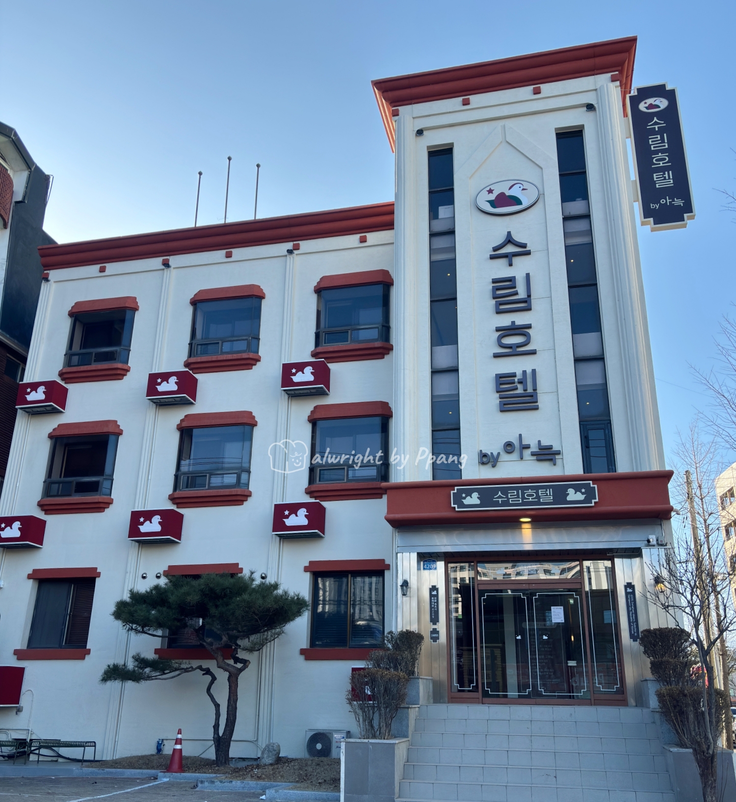 수림호텔 바이아늑의 외관은 창문에 하나씩 달린 오리들이 귀엽다. 음. 이건 에어콘 실외기 박스이다. 잘 가렸네.
